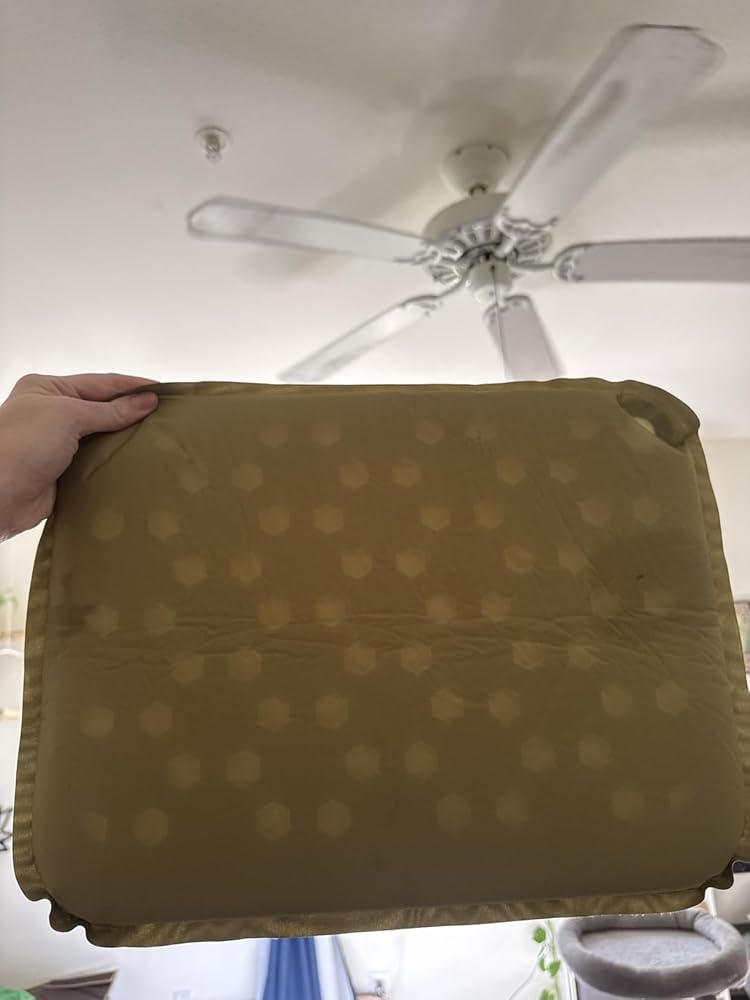 This inflatable seat is surprisingly comfortable and versatile, and works perfectly for it's intended uses. So far I have used it for picnic benches, camping (in my foldable chair and on the ground) and even for car rides. The only issue I had with it was that when I left it in my vehicle for a few hours, the cushion kind of bubbled up. It was still comfortable to sit on though! I LOVE how lightweight it is, very convenient to travel with and takes up very little space, and it's easily compactable again after use. It's relatively easy to use in general, inflating was super fast and easy, and deflating was no problem at all. I'd say it's decent quality. It's a pretty color, very "outdoorsy" vibes. Great price point.