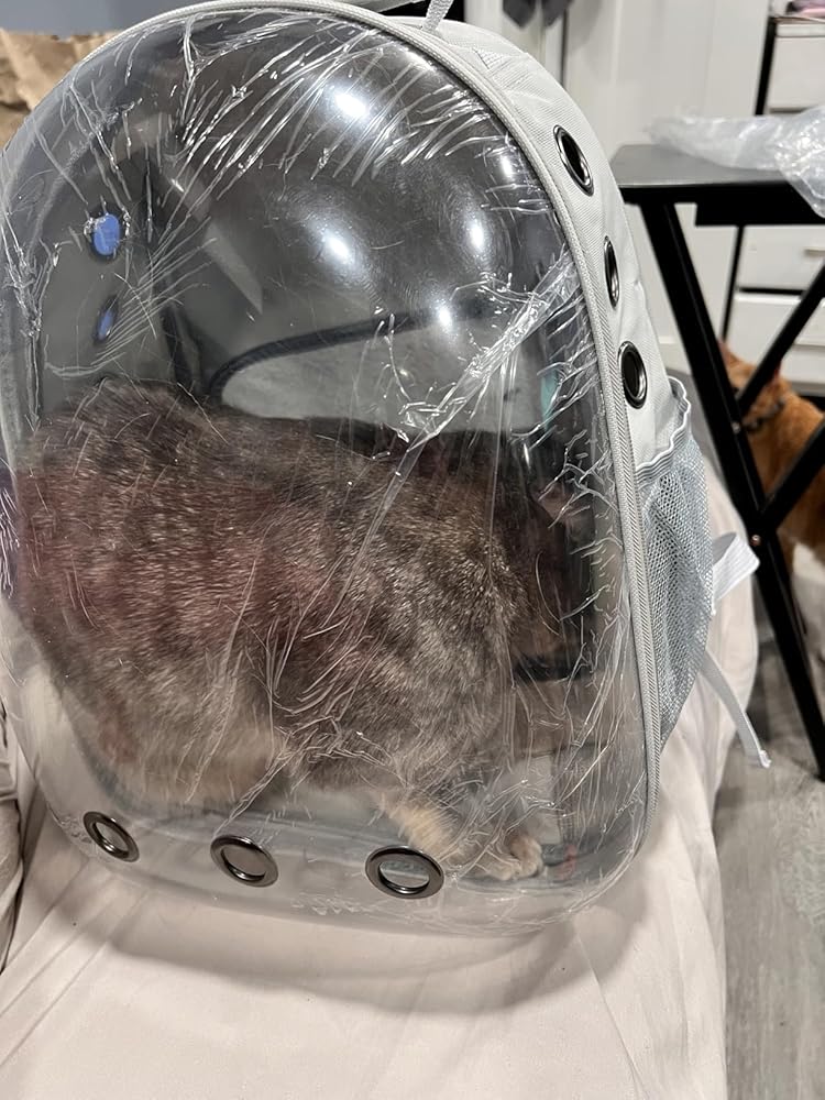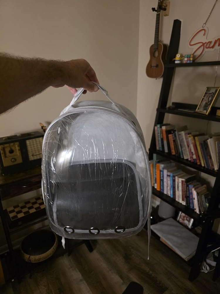 This transparent backpack is spectacular because my cat can look around without getting stressed. It's very easy to carry, and you always have your hands free. It's very pretty and aesthetically pleasing! It has holes so the cat can breathe comfortably. My cat loved it, and I highly recommend it!