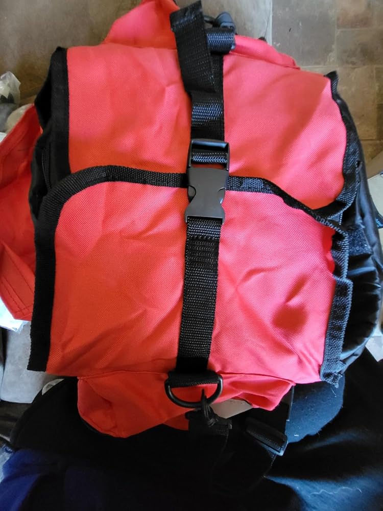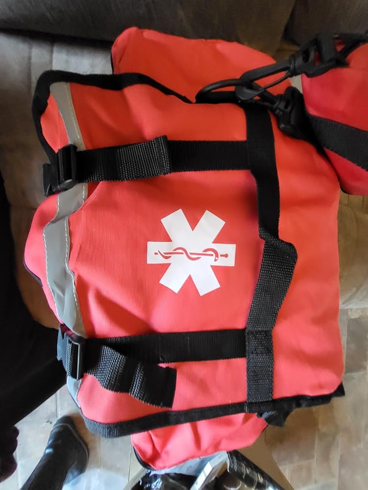 I am very impressed with this First Aid bag. It is bright and has reflective ribbons sewn into the exterior, has easy to carry handles and an adjustable shoulder strap. It is built tough and well padded to protect whatever you might need to pack inside. This one is awesome. It closes securely and has an interior compartment with removable pieces that allow you to customize the main area to fit/organize everything according to your needs. The side zipper compartments I also love and give you room to separate out your different things here from what you might carry in the large compartment. I like to occasionally stock up and throw out expired First Aid supplies for our house and for the first time have a really nice way to organize all the things we keep around for cuts, scrapes, burns, and bee stings. Great bag, this one.