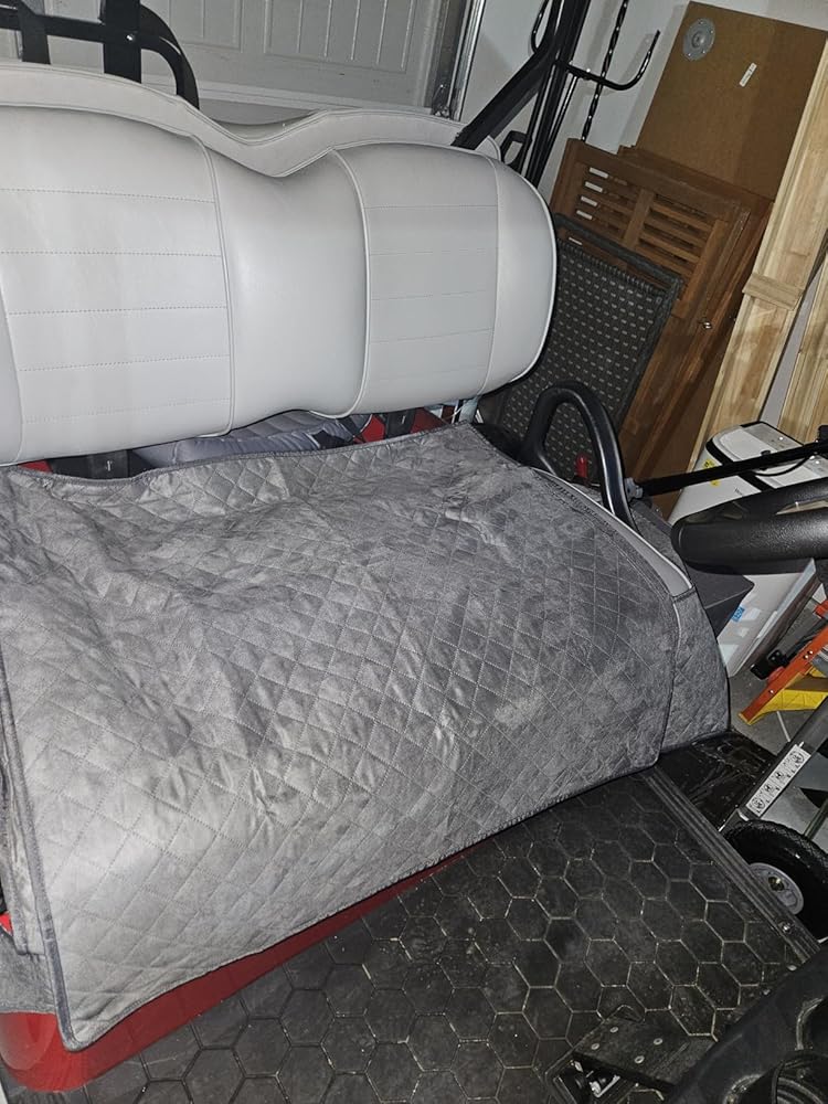 A perfect fitting seat cover for my golf cart.Very easy to setup with one drop from the hand inserts.Very comfortable seat covers, keep seat cool throughout the summer and for keeping the leather seat safe from scratches.Covers full space in the front and easy to adjust velcro straps on either sides.Good value for money as this helps my pet's not scratch my leather seat and it is easy to clean and vacuum.Very inexpensive and affordable seat cover.Love my purchase and I recommend this for any golf cart as it fits mostly all golf carts.