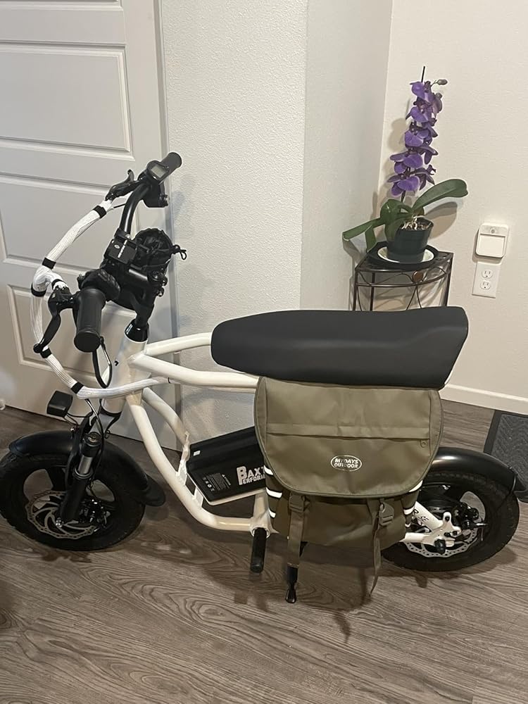 I been looking for a hands free solution to carry some grocery & things without a backpack on or hanging bags on my handle bar. A bike rack wouldn't work for my eScooter cause it would be too big, or block the battery, and I didn't want weight on a front rack or basket to throw off my steering. The color, build and size is perfect my quick errand machine. I made this pannier saddlebag to be a fixed under my bolted seat like a modern day horse!