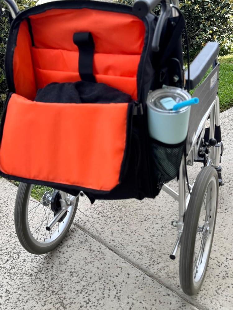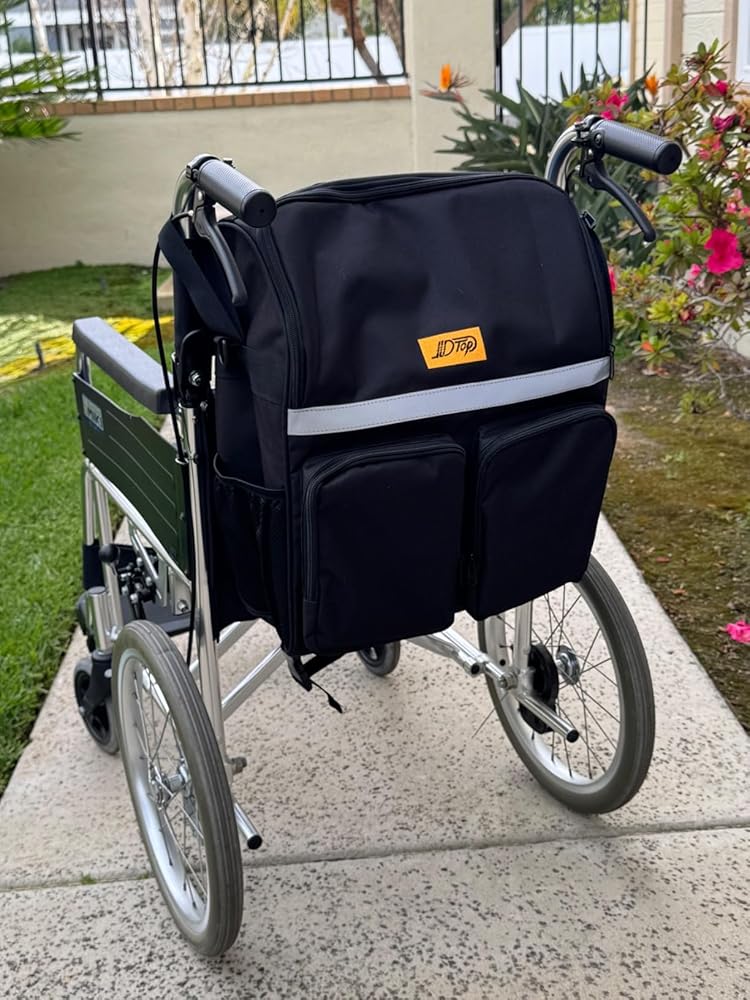 I'm using a wheelchair while recovering from ankle surgery and was worried about our upcoming vacation. I thought this bag would come in handy with all the things I need to carry. I will take it off the wheelchair and use it as my personal carry-on item instead of a purse on our flight and will put it back on the wheelchair once we reach our destination. I was impressed by the overall size and capacity while still being able to fit on the back of my small travel wheelchair. It seems durable and well made with no issues with the seams or zippers. The only issue I had was my own fault for not noticing how the bag attaches to the wheelchair. The lanyard loops are designed to easily slip over the two handles on the back of a standard wheelchair, but my chair has a different set up. It is a bar type handle with no open ends, like you would usually see on a stroller. The fix was easy though. I employed reusable velcro zip ties to connect the lanyards around my bar handle which allows me to put the bag on and off as many times as needed. The bag also has a top handle and a removable shoulder strap to use when not on the chair. The price seems fair for something that will make my trip a whole lot easier.
