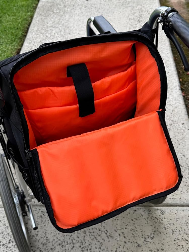 Great quality! Ample storage. Easy to use. Large enough to house wheelchair charging cord, meds, and small medical equipment like wrist BP machine, pulse oximeter and personal effects.
